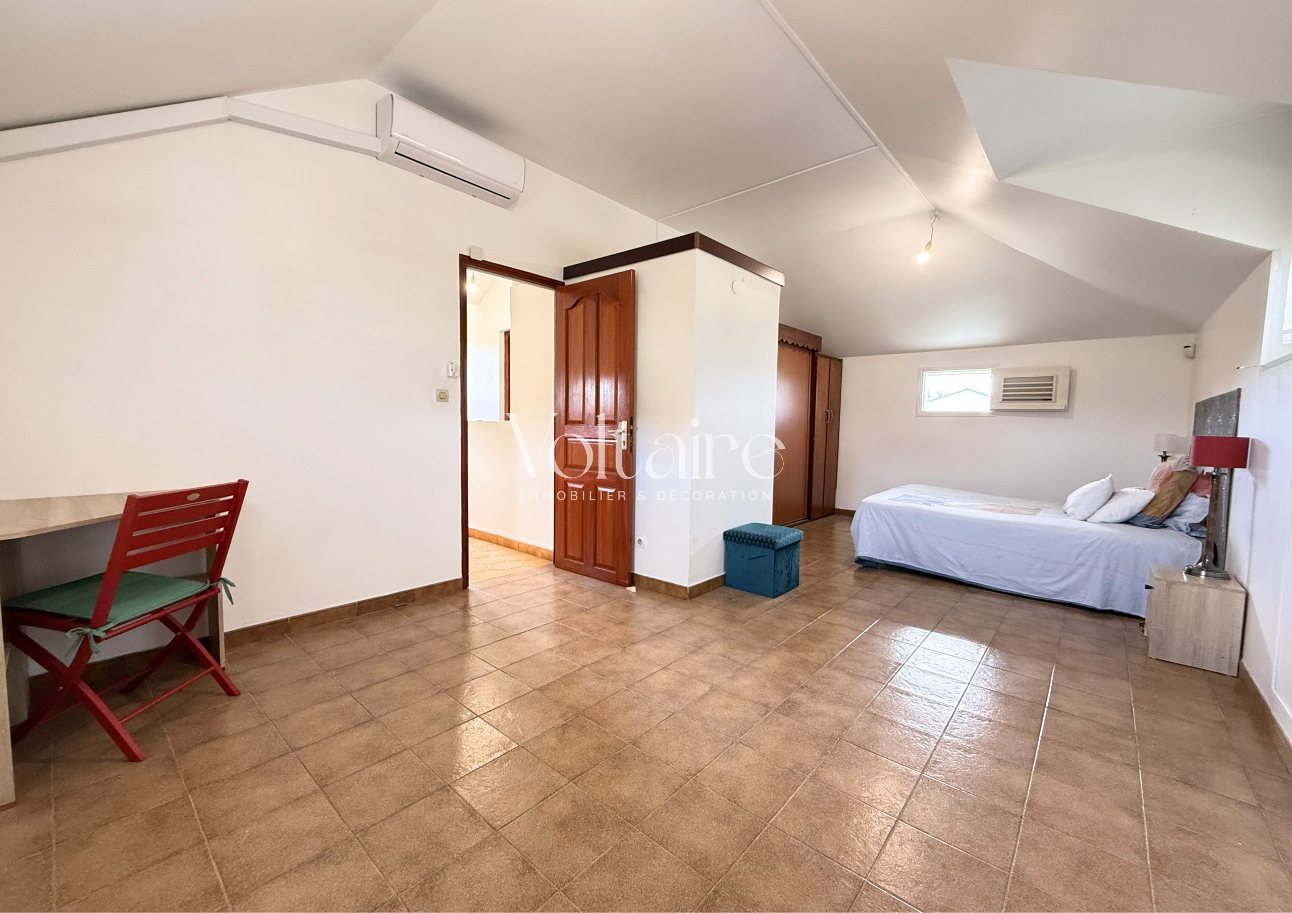 À l’étage, se trouvent une chambre climatisée, une salle de bain avec douche et baignoire, et un espace supplémentaire pouvant servir de bureau ou de salle de jeux.