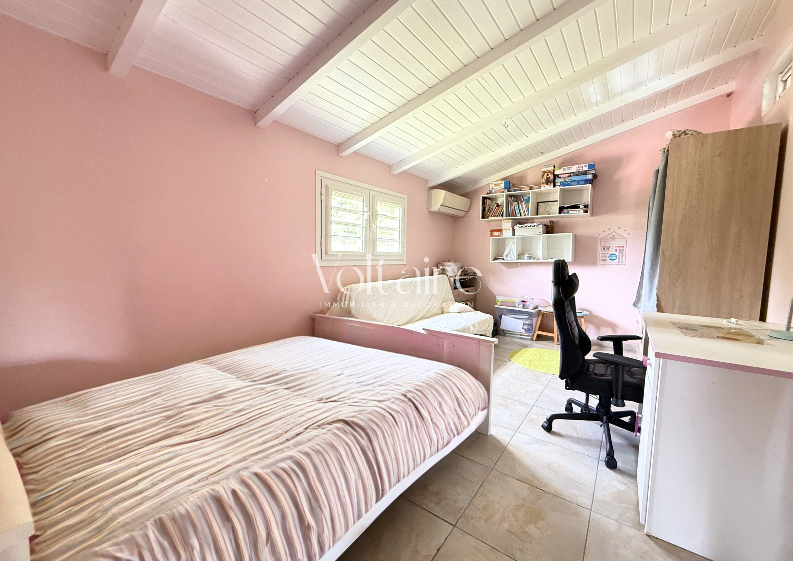 À l’étage, on retrouve cinq chambres climatisées, dont trois avec salle d’eau attenante.