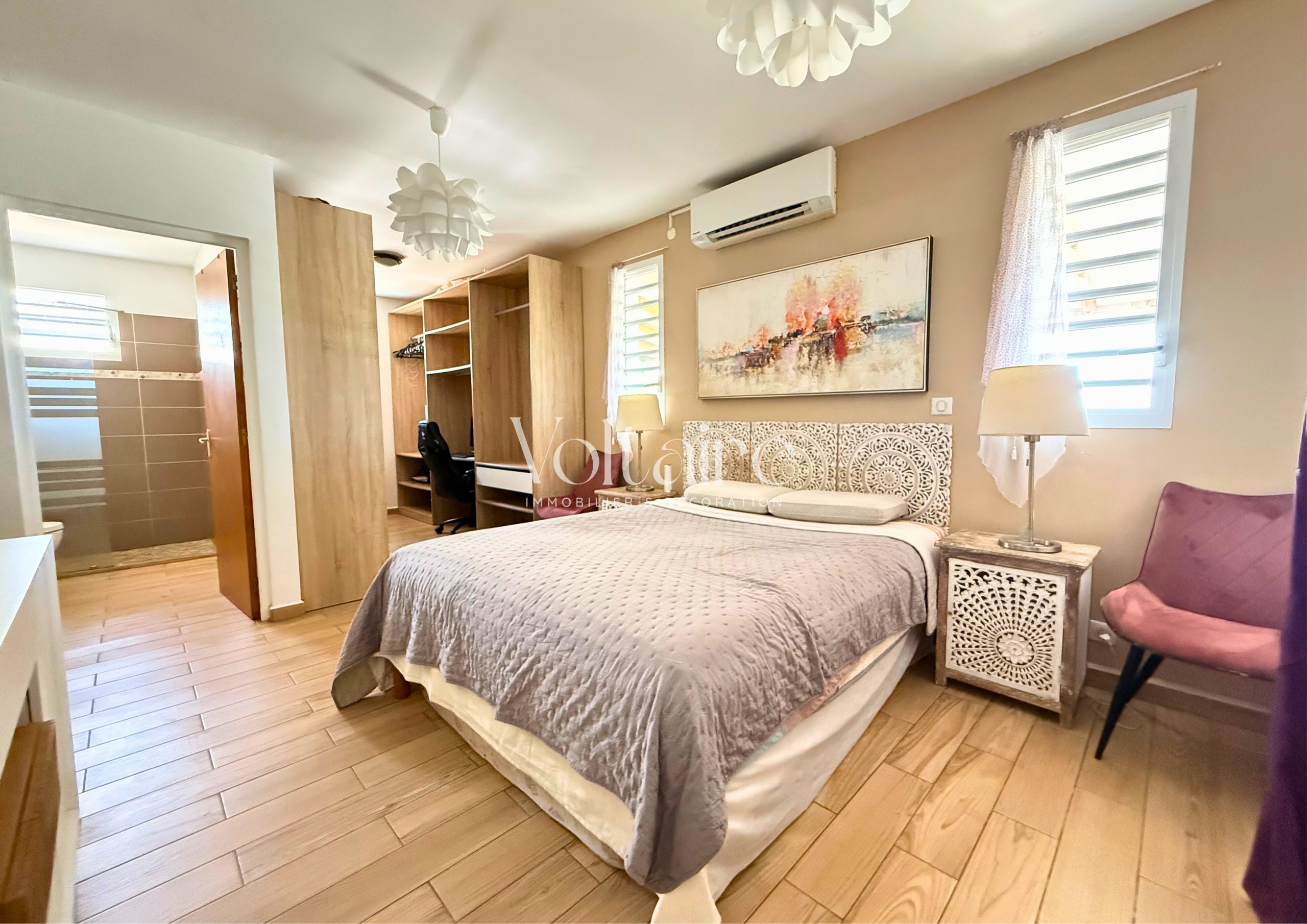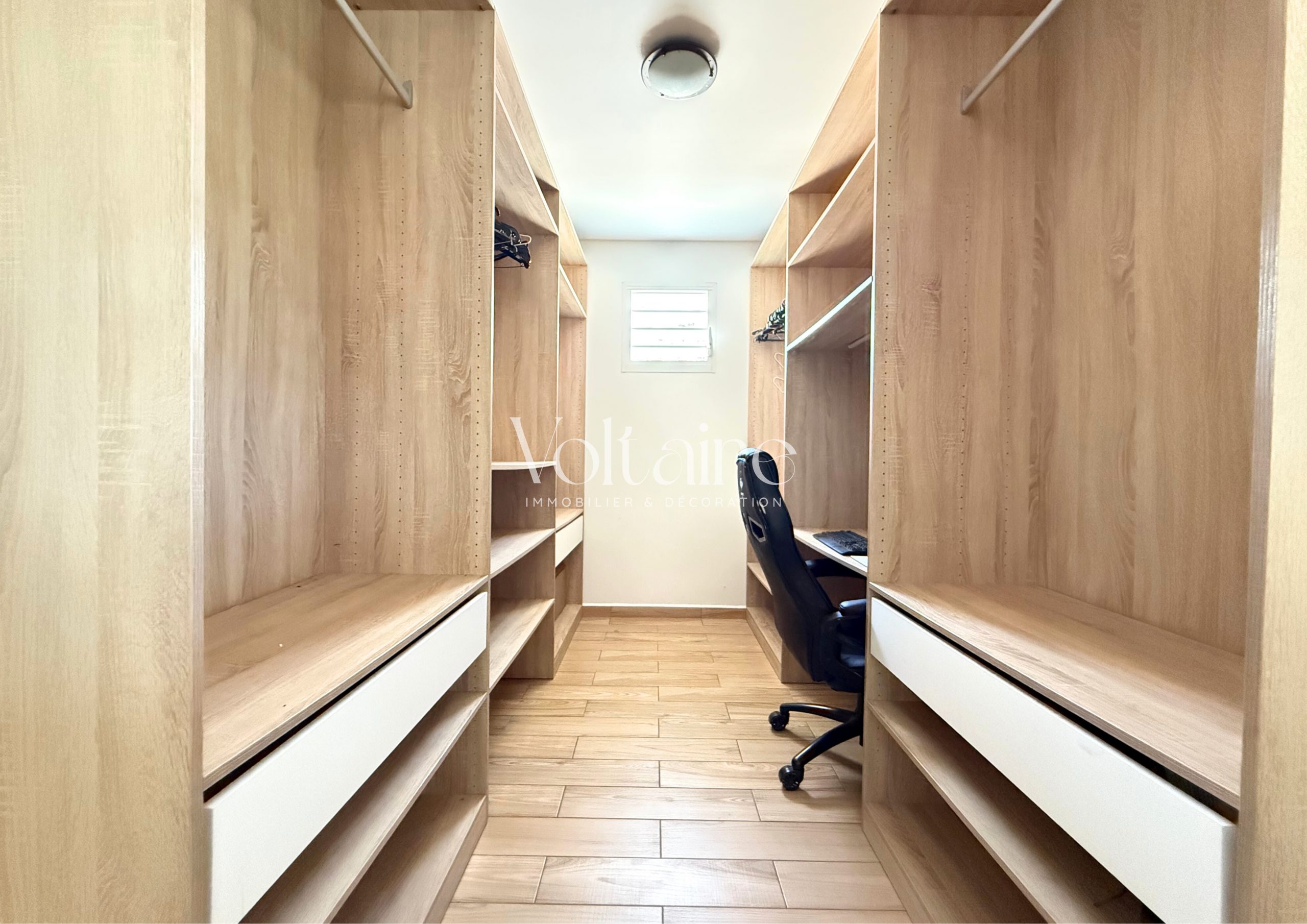 La partie nuit comprend trois chambres climatisées, dont une suite parentale avec salle d’eau privative et dressing, une salle d’eau supplémentaire et un WC séparé.