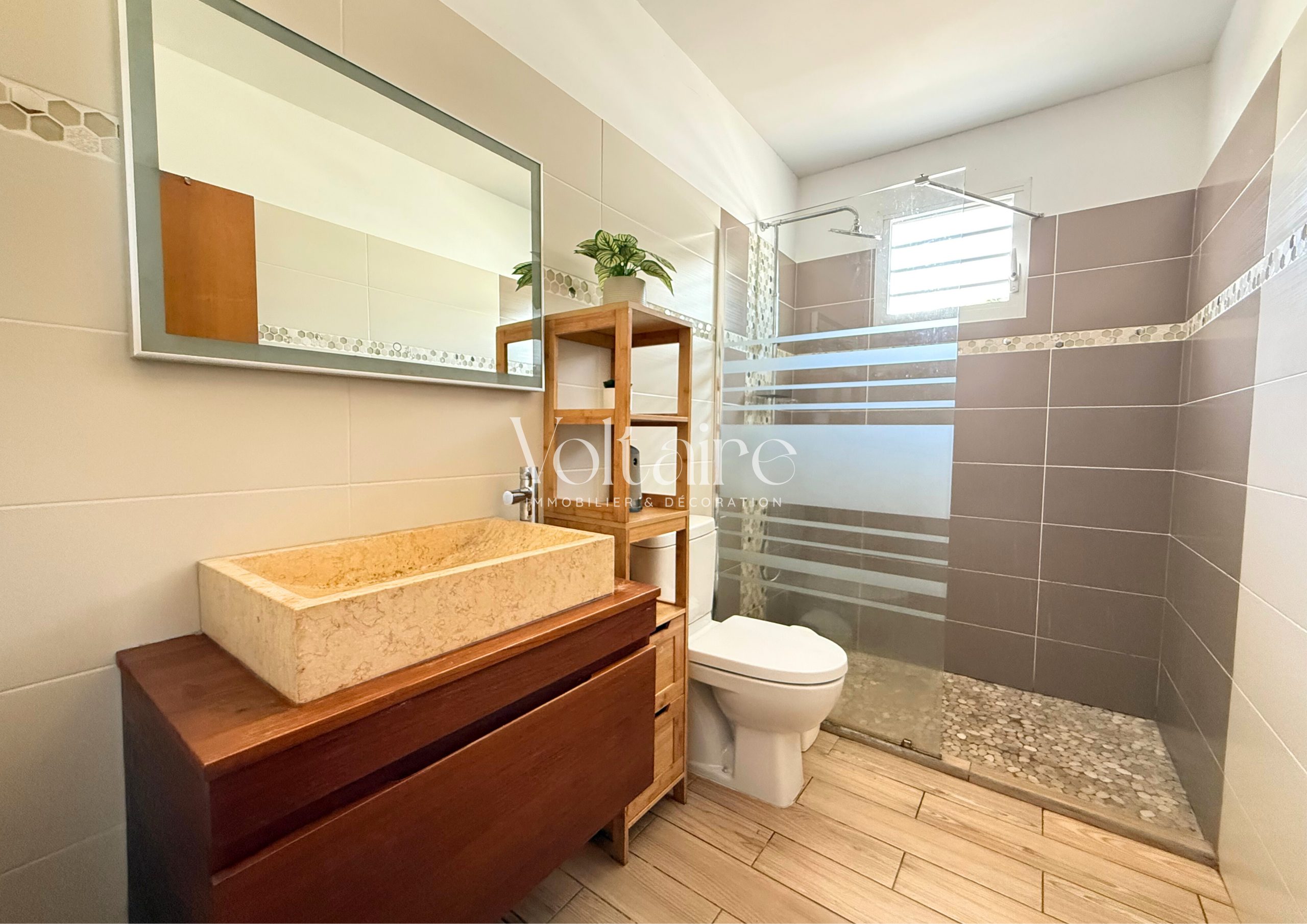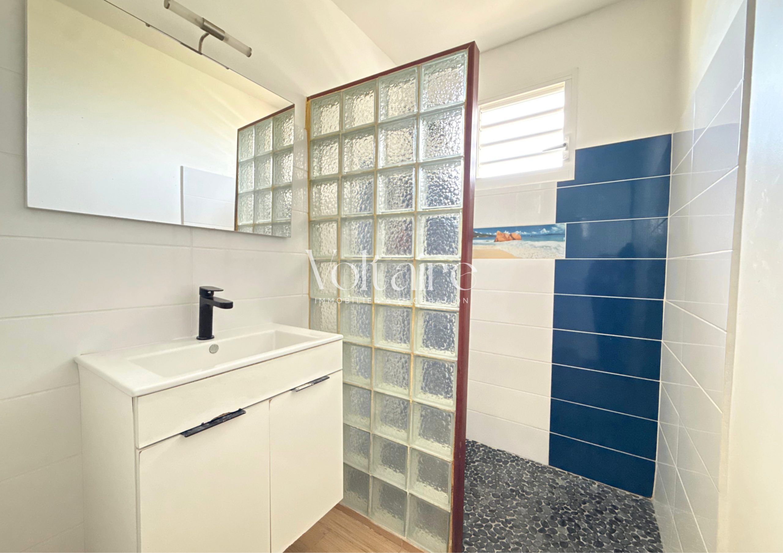 Elle se compose d’une entrée desservant une grande pièce de vie climatisée avec séjour et cuisine ouverte. La cuisine, entièrement équipée, comprend un four, un micro-ondes, un réfrigérateur et un lave-vaisselle. Une buanderie attenante est aménagée avec lave-linge et sèche-linge.